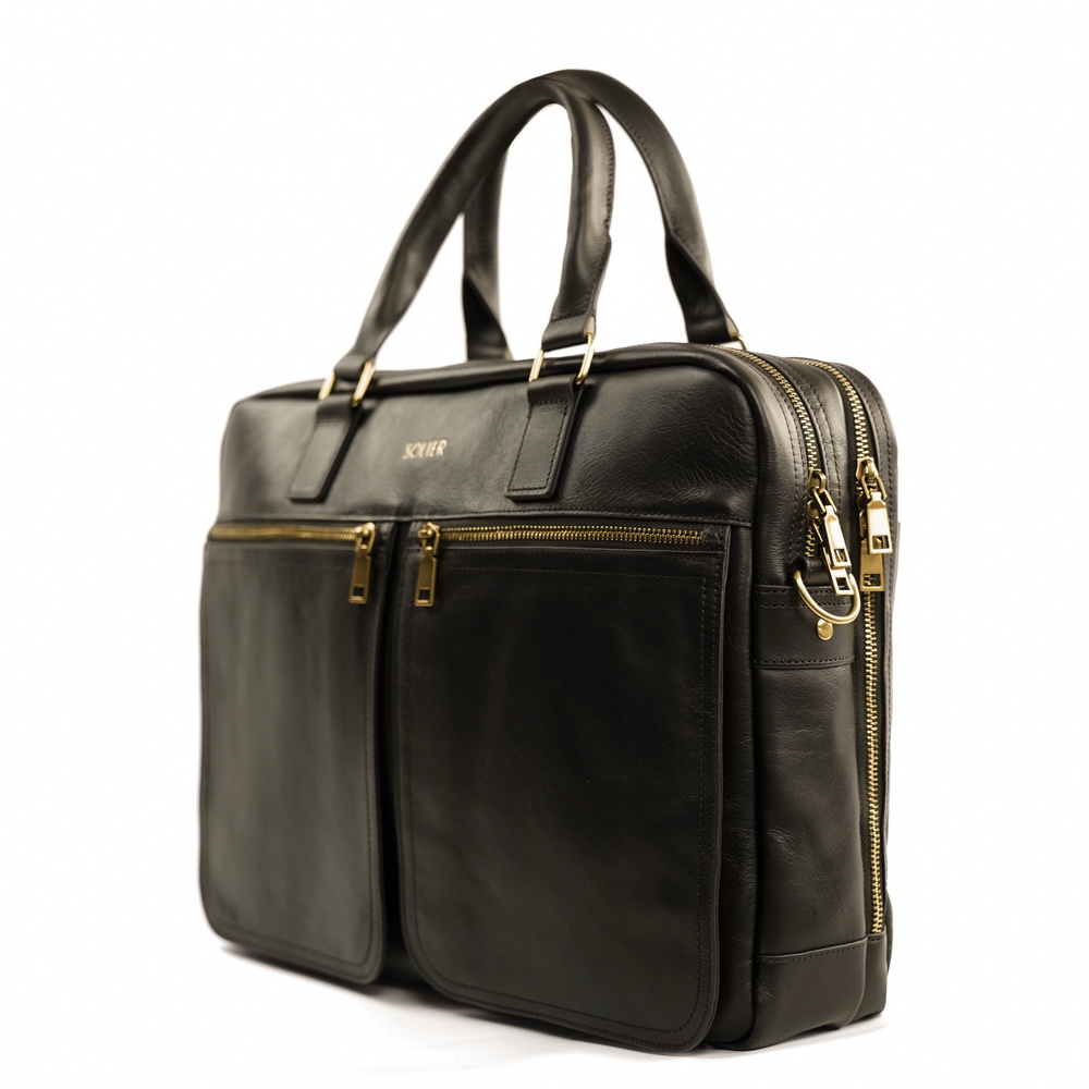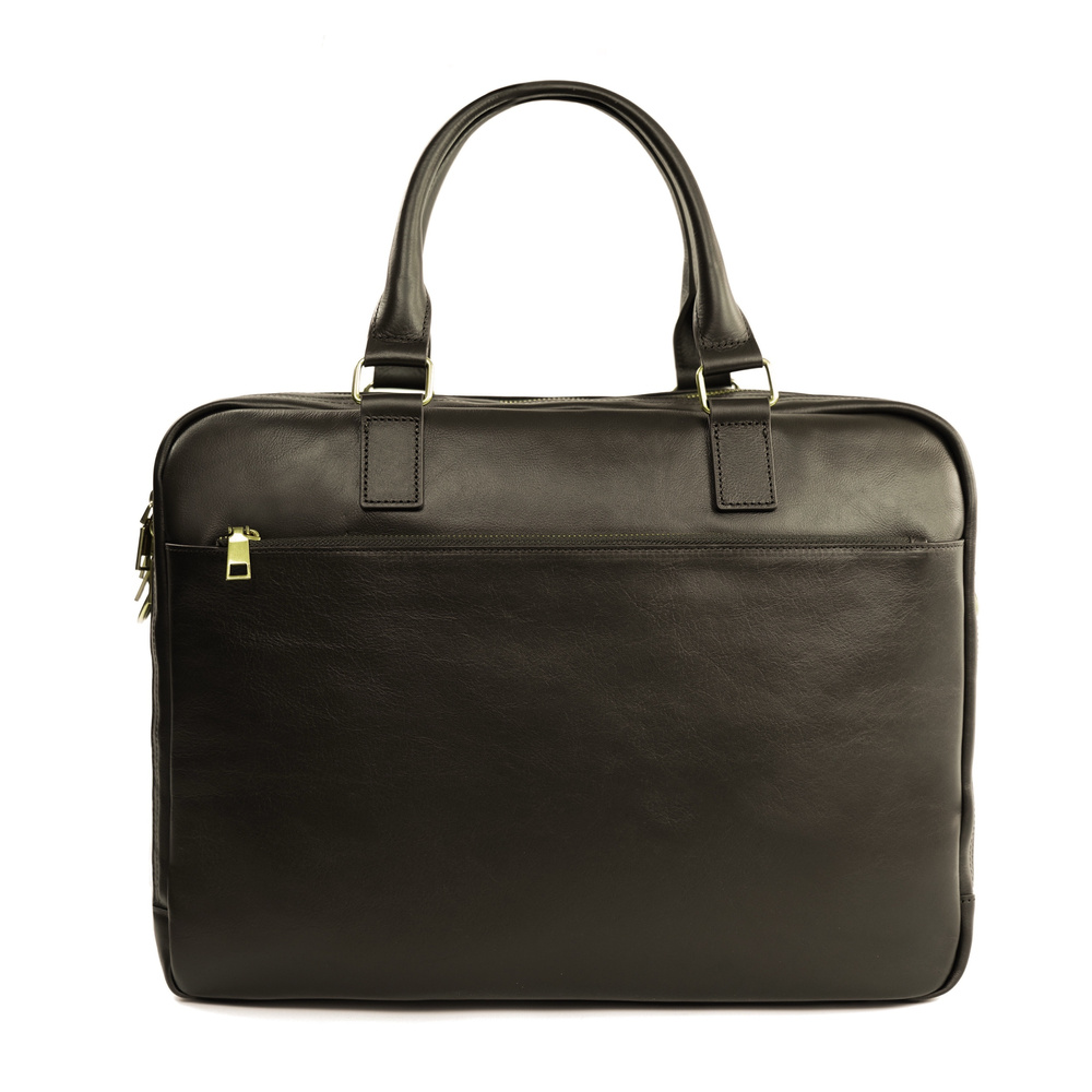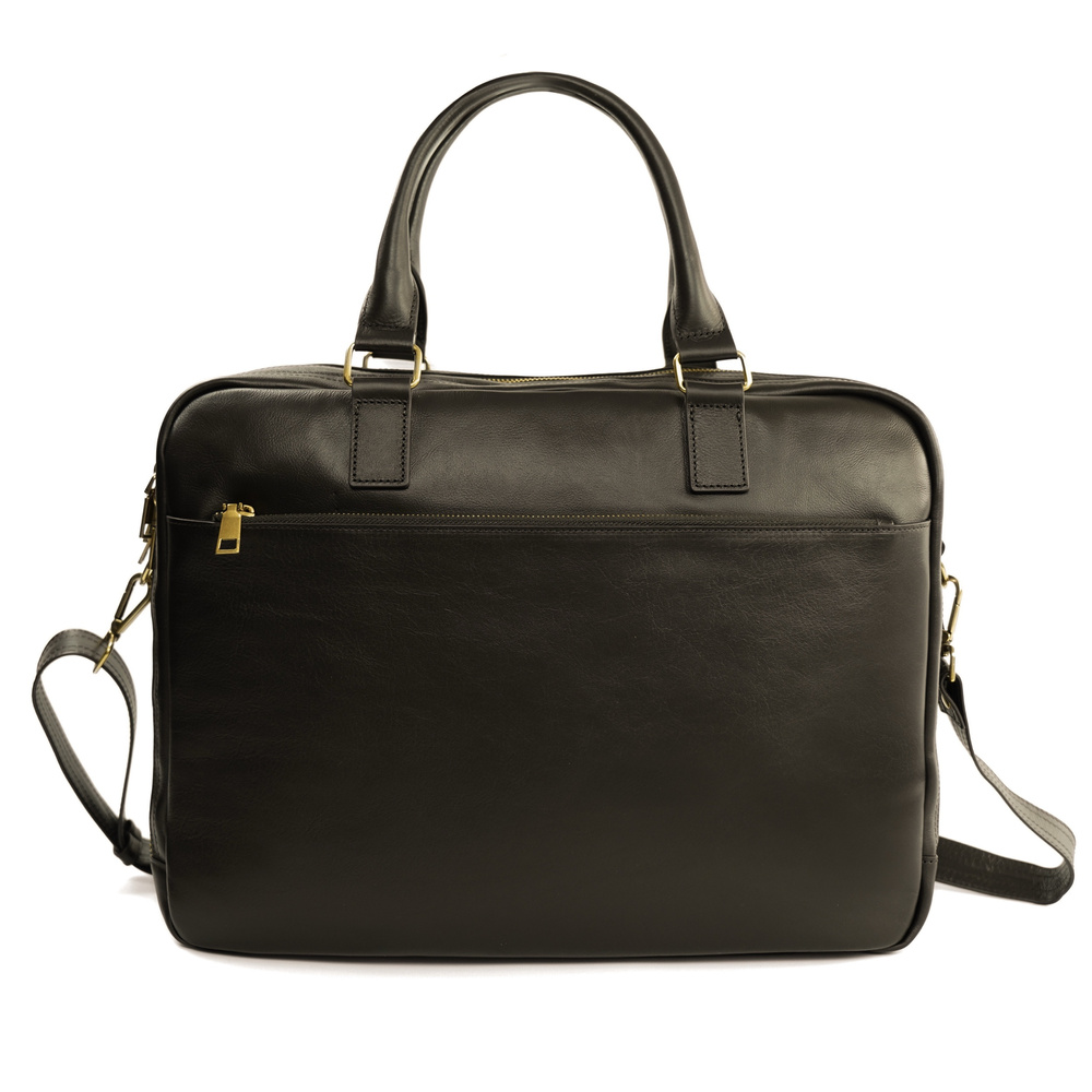 Model DUNDEE został wykonany z wysokogatunkowej skóry naturalnej, która nadaje torbie eleganckiego wyglądu i gwarantuje trwałość przez lata. Wewnątrz znajduje się wodoodporna komora główna z piankową przegrodą mieszczącą laptopa o przekątnej do 17", a także dodatkowa kieszeń zapinana na zamek – idealna na dokumenty, telefon czy portfel. Całość wykończona została czarną, wodoodporną podszewką.