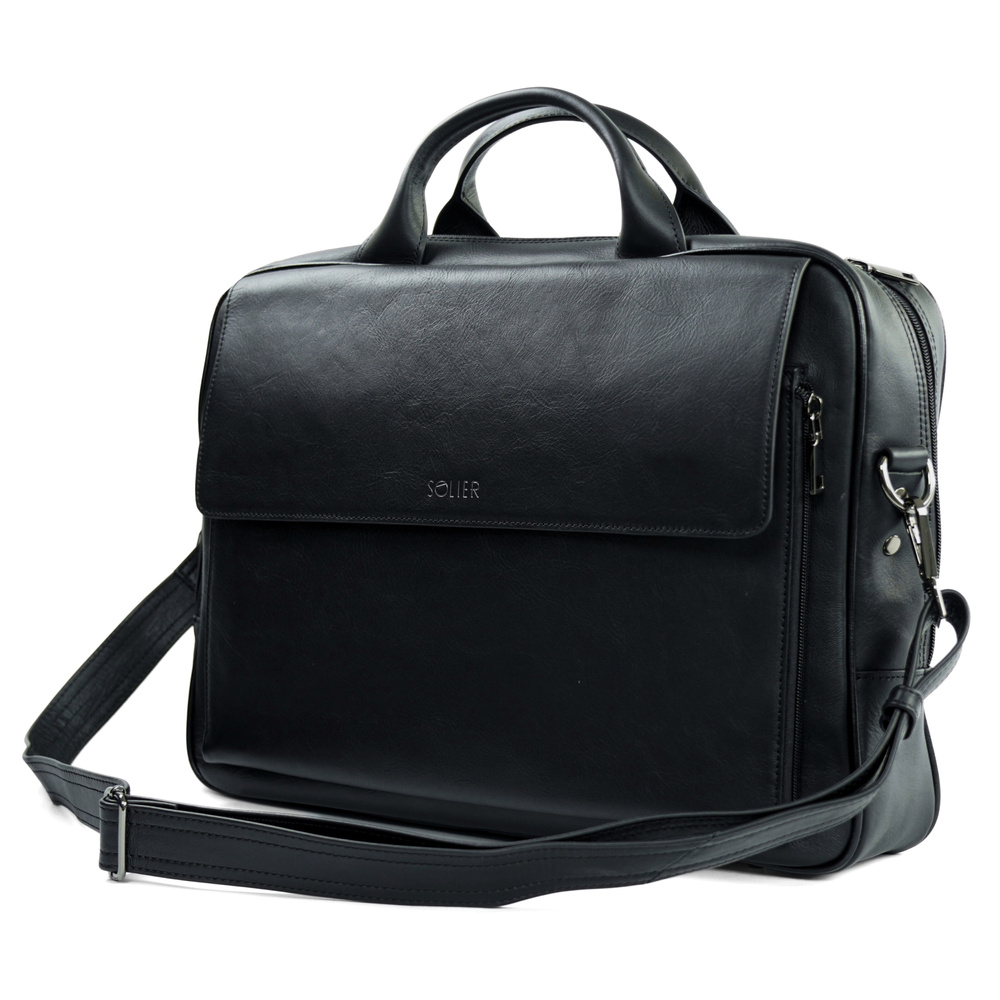 Z przodu torby znajduje się duża kieszeń zapinana na dwa magnesy, wewnątrz której umieszczono praktyczne przegrody na telefon, dokumenty i karty. Z tyłu znajduje się kieszeń zamykana suwakiem, która po otwarciu dzieli się na trzy wygodne przegrody. Całość dopełnia solidny, regulowany skórzany pasek na ramię (ok. 145 cm) oraz wzmacniane rączki, dzięki którym torba dobrze leży zarówno w ręce, jak i na ramieniu. Metalowe stopki na spodzie chronią ją przed zabrudzeniami i zniszczeniem, a całość prezentuje się wyjątkowo estetycznie i profesjonalnie.