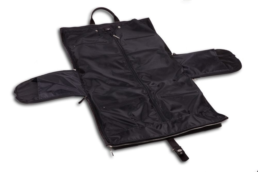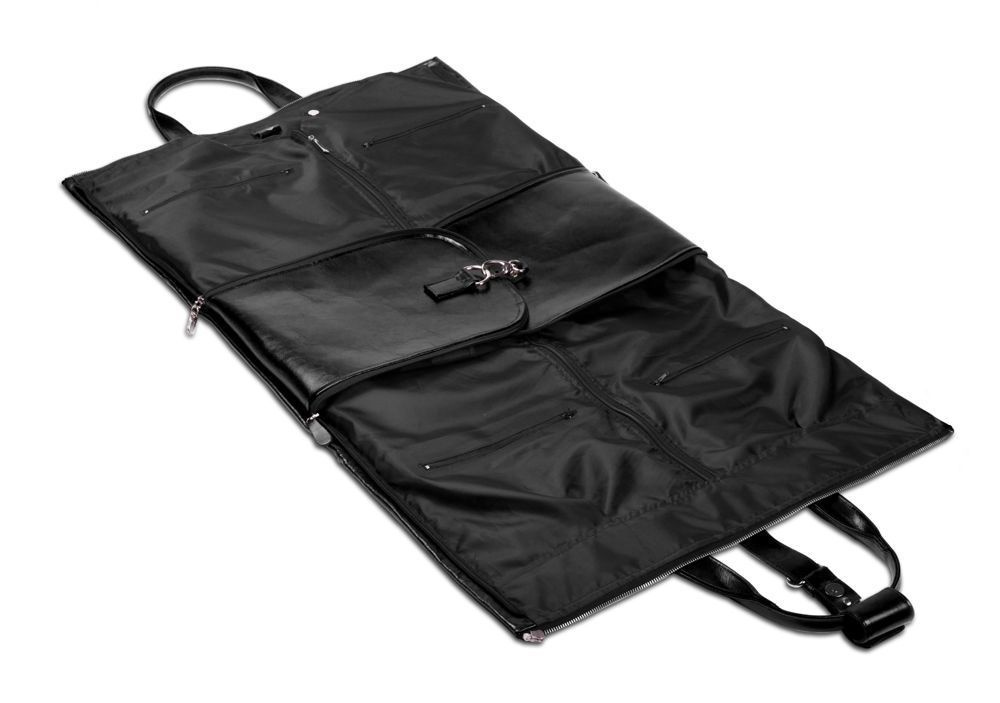 Cała torba wyposażona w zamki, które umożliwiają jej całkowite rozłożenie i uzyskanie płaskiego pokrowca na garnitur.