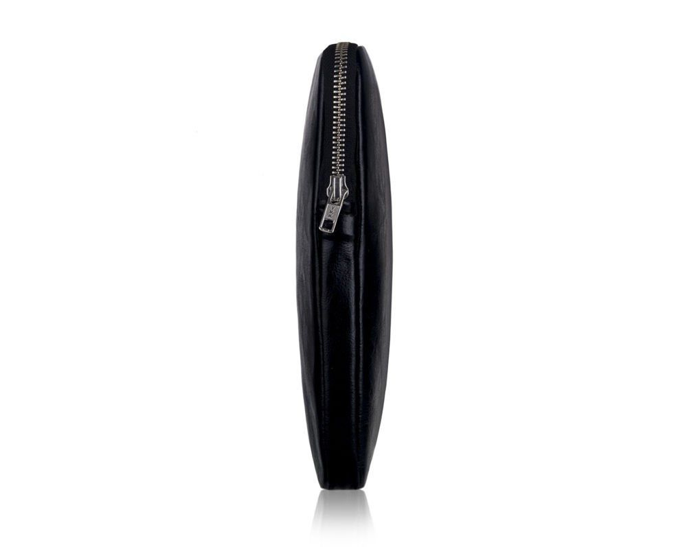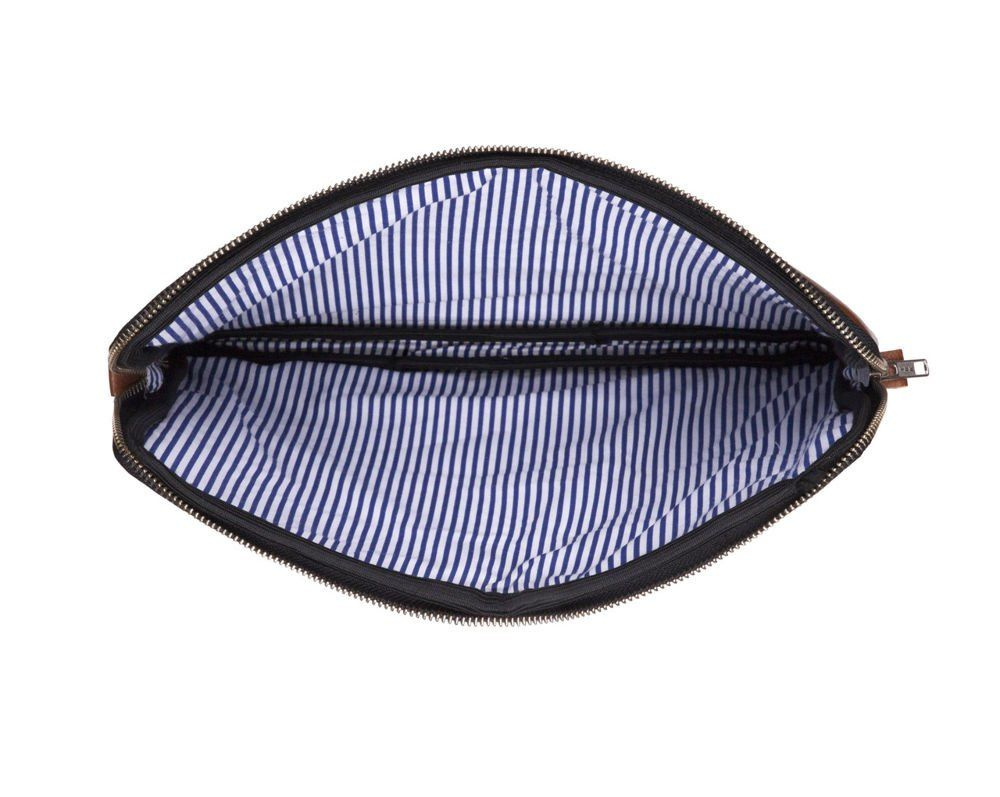 Skórzany pokrowiec pozwoli na transportowanie laptopa chroniąc go przed ewentualnym zabrudzeniem lub uszkodzeniem. Dzięki płaskiej budowie świetnie dopasuje się do torby lub plecaka. Łatwy w noszeniu, zapisany jest na zamek błyskawiczny YKK, który chroni laptop przed wysunięciem. Wewnątrz elegancka bawełniana podszewka w granatowe paski.