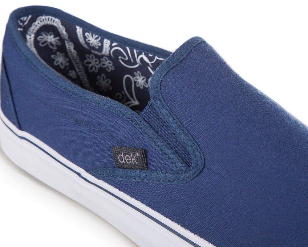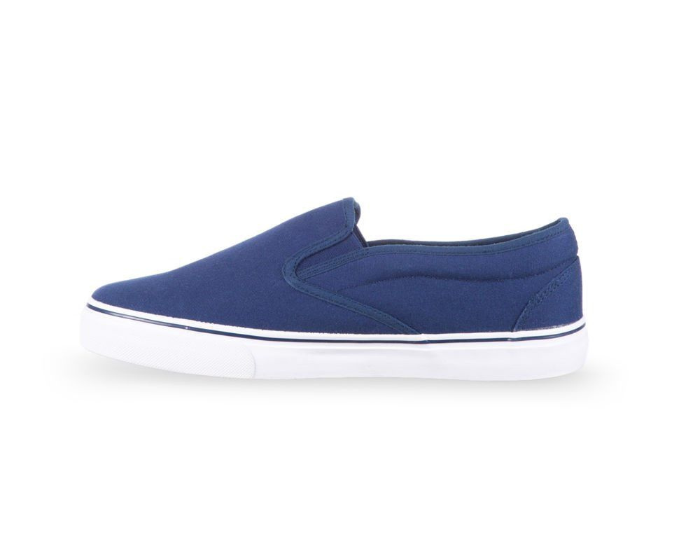 Klasyczne męskie trampki typu slip on wykonane z trwałego materiału. Wyposażone w gumowe wstawki po bokach, które ułatwiają zakładanie i zdejmowanie butów. W środku znajduje się tekstylna podszewka. Mocna, wulkanizowana podeszwa klejona do cholewki buta, zapewnia stabilność i wygodę. Świetnie sprawdzą się do codziennego użytku. Idealne zarówno do klasycznych jeansów jak i letnich spodenek czy spodni typu chinos.