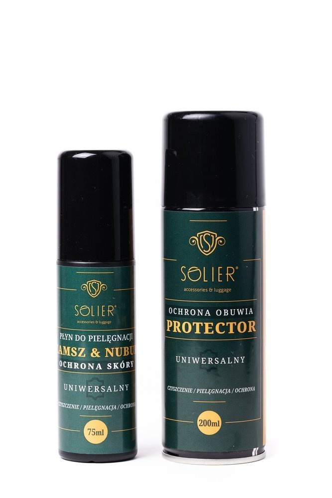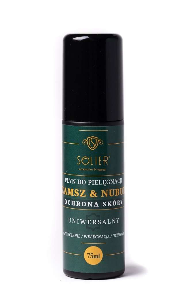 Płyn pielęgnujący Solier to szybki i skuteczny sposób na odnowienie koloru zarówno naturalnego jak i sztucznego zamszu i nubuku. Skutecznie wyrównuje kolor sprawiając, że buty będą wyglądać jak nowe przez długi czas. Nadaje się również do tekstyliów. Nie zmienia właściwości oddechowych skóry. Zalecany do obuwia z membraną klimatyczną. Wygodny w użyciu aplikator pozwala na równomierne rozprowadzenie środka po powierzchni, nie zostawiając śladów.