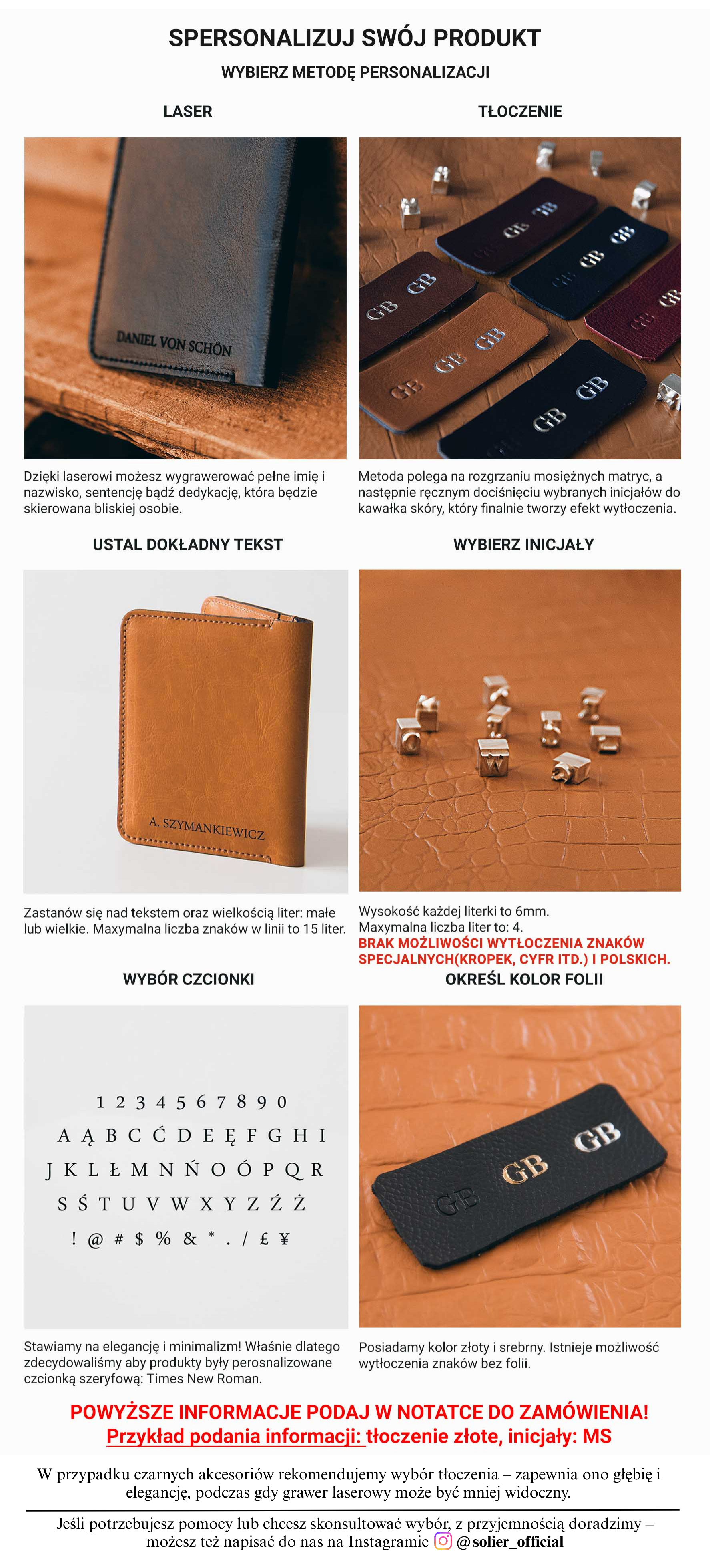 Metoda polega na rozgrzaniu mosiężnych matryc, a następnie ręcznym dociśnięciu wybranych inicjałów do kawałka skóry, który finalnie tworzy efekt wytłoczenia. Personalizacja wykonana jest ręcznie przez naszych technologów, którzy używają najwyższej jakości sprzętu. Dzięki temu możesz być pewien jakości wykonanej przez nas usługi.