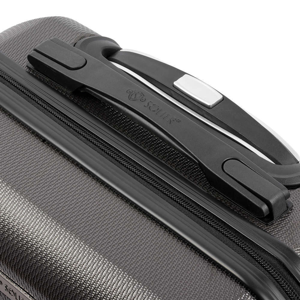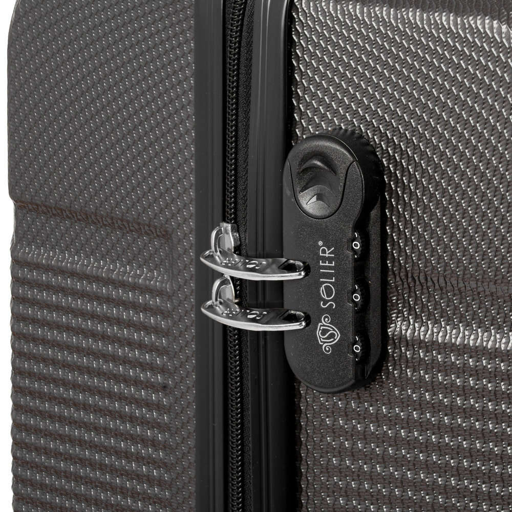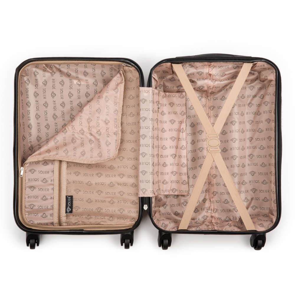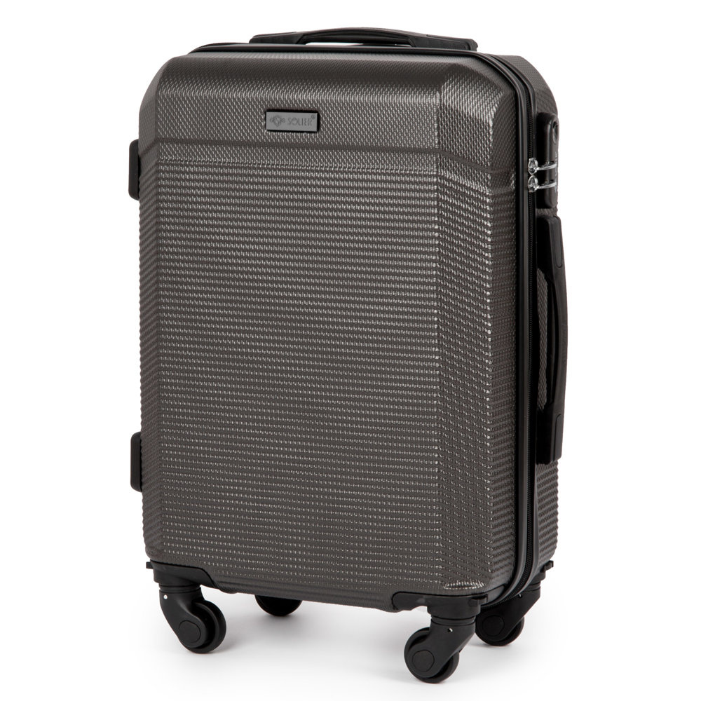 Podróżna walizka mała S marki Solier stworzona z myślą o najbardziej wymagających klientach. Nowoczesny, lekki model wykonany z bardzo wytrzymałego i odpornego na zarysowanie tworzywa ABS Plus. Wyposażony w dwupoziomową teleskopową rączką oraz zewnętrzne, przyjemne w dotyku gumowe uchwyty. Zabezpieczony zamkiem szyfrowym uniemożliwiającym dostanie się do wnętrza osobom niepożądanym. Posiada trwały, duraluminiowy stelaż wbudowany w walizkę oraz cztery obrotowe kółka, które zapewniają stabilność oraz lekkość i wygodę prowadzenia. Wnętrze wyposażone zostało w wewnętrzne pasy mocujące, zabezpieczające bagaż oraz w sygnowaną podszewkę dzieloną zamkiem błyskawicznym na dwie komory.