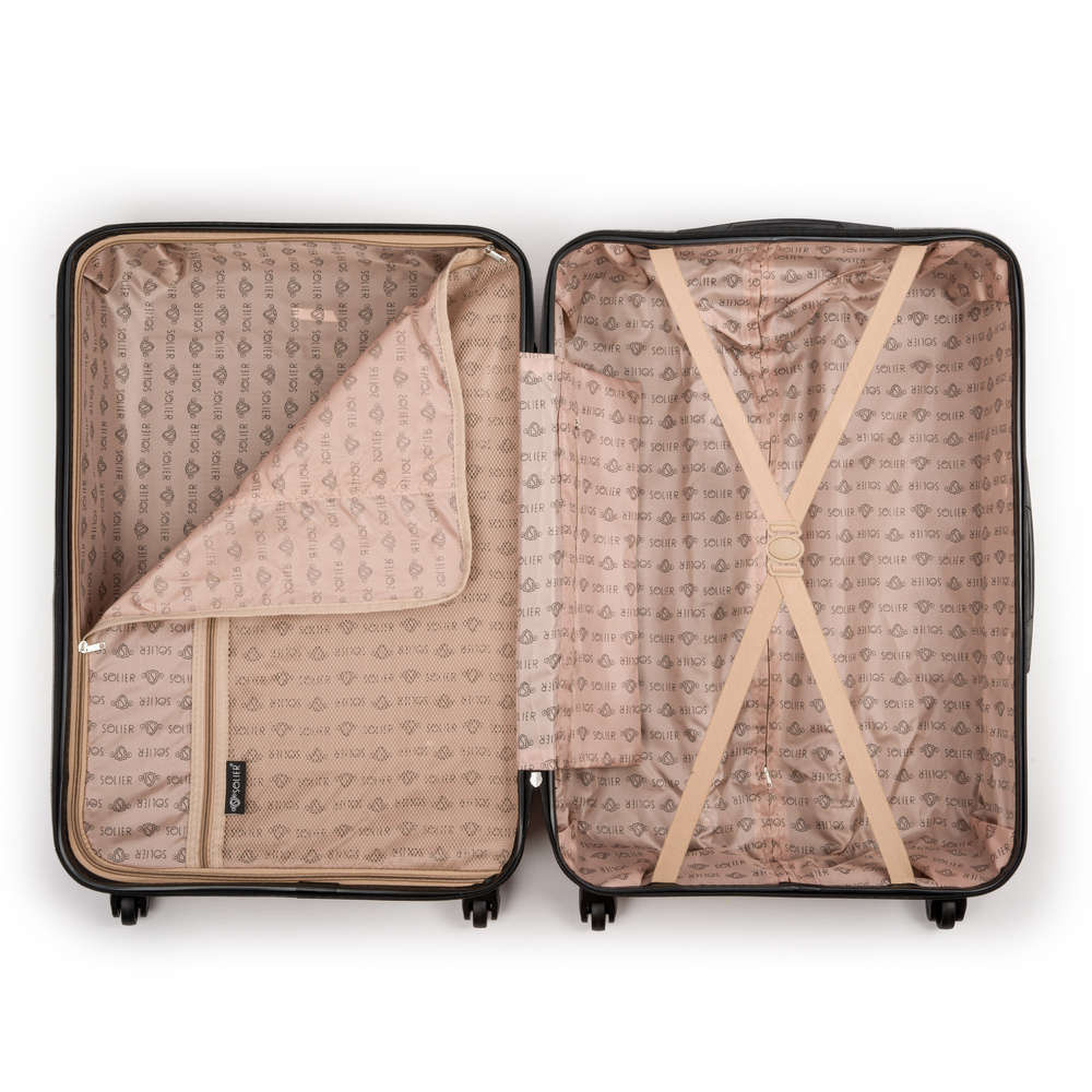 Podróżna walizka średnia M marki Solier stworzona z myślą o najbardziej wymagających klientach. Nowoczesny, lekki model wykonany z bardzo wytrzymałego i odpornego na zarysowanie tworzywa ABS Plus. Wyposażony w dwupoziomową teleskopową rączką oraz zewnętrzne, przyjemne w dotyku gumowe uchwyty. Zabezpieczony zamkiem szyfrowym uniemożliwiającym dostanie się do wnętrza osobom niepożądanym. Posiada trwały, duraluminiowy stelaż wbudowany w walizkę oraz cztery obrotowe kółka, które zapewniają stabilność oraz lekkość i wygodę prowadzenia. Wnętrze wyposażone zostało w wewnętrzne pasy mocujące, zabezpieczające bagaż oraz w sygnowaną podszewkę dzieloną zamkiem błyskawicznym na dwie komory.