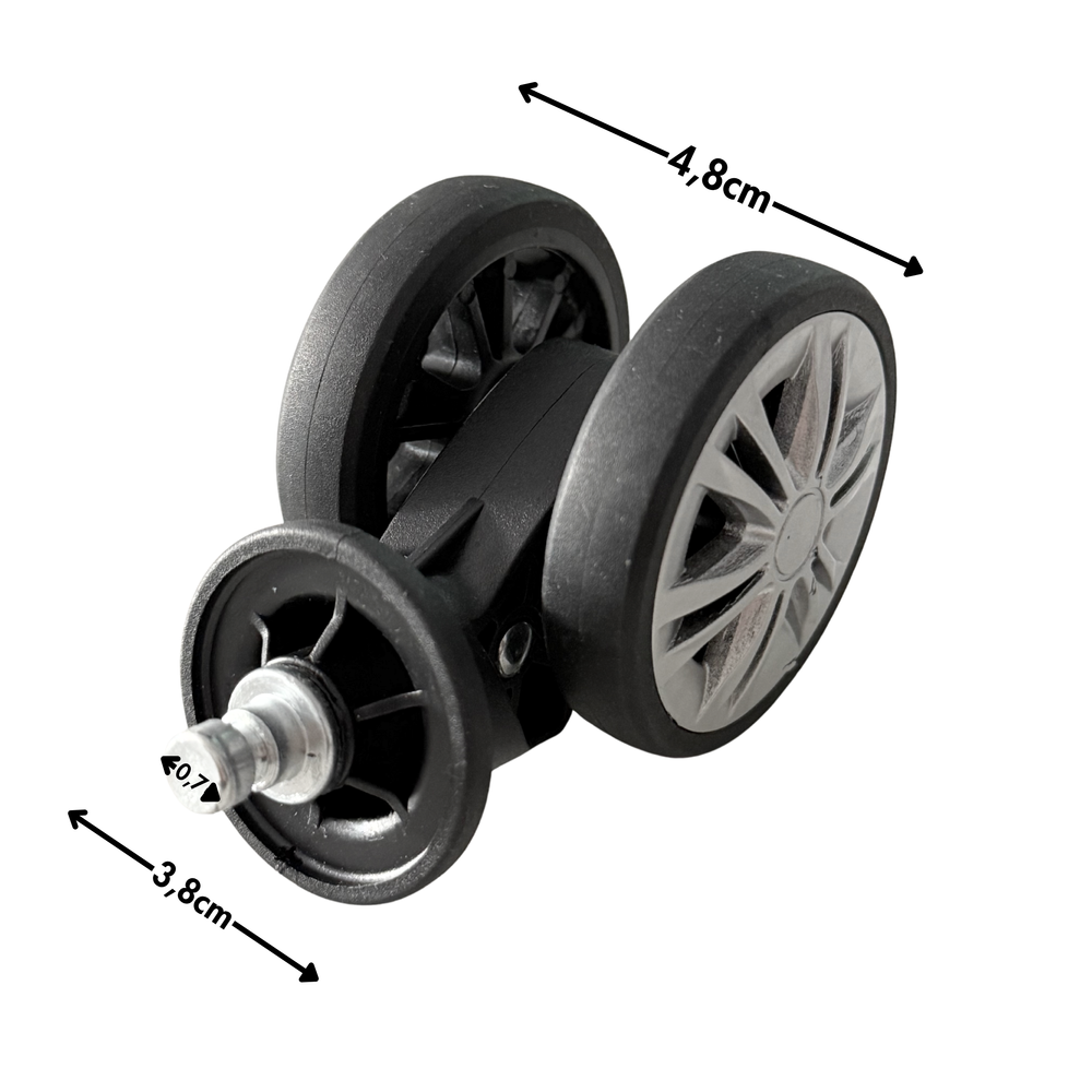 Kółko w Twojej walizce zostało uszkodzone? Nie musisz wymieniać całej walizki! Oferujemy zapasowe kółko do walizek ABS oraz materiałowych z opcją wypinania kółek. Bardzo proste w montażu. Posiadają przycisk mocujący, który w łatwy sposób umożliwia wypięcie uszkodzonego kółka i zamontowanie nowego. Podwójne kółka zapewniają większą stabilność i łatwiejsze manewrowanie, zwłaszcza na nierównych powierzchniach. Pozwalają na płynniejsze prowadzenie walizki w różnych kierunkach, w tym na 360 stopni.