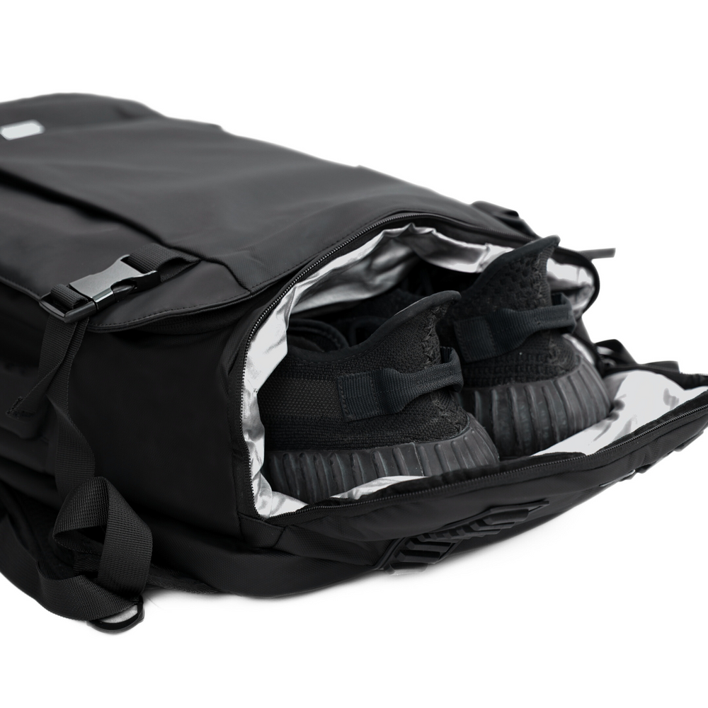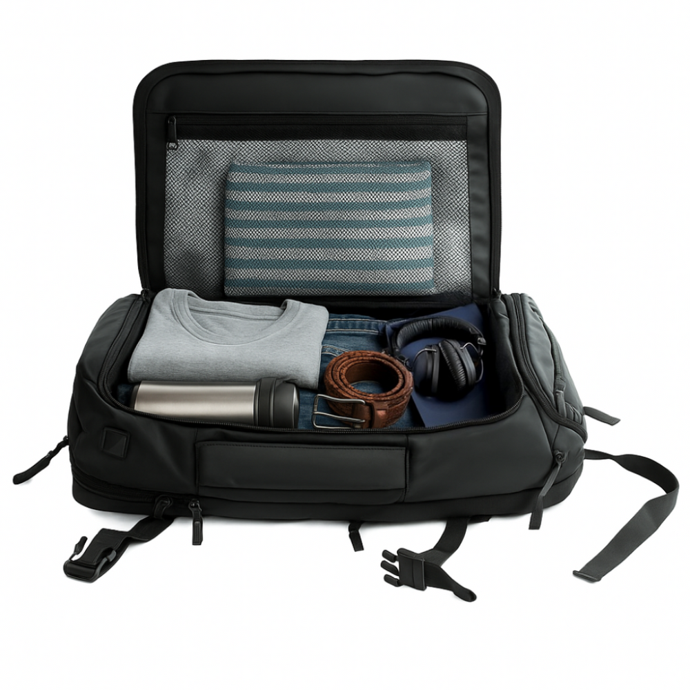Główna komora przypomina wnętrze walizki lub torby podróżnej  – może być otwierana na płasko. Spakujesz się bez trudu na 2–3 dni, a wszystko będzie pod ręką. W środku znajdziesz również wodoodporną kieszeń na zamek – idealną na kosmetyki, dokumenty lub elektronikę.