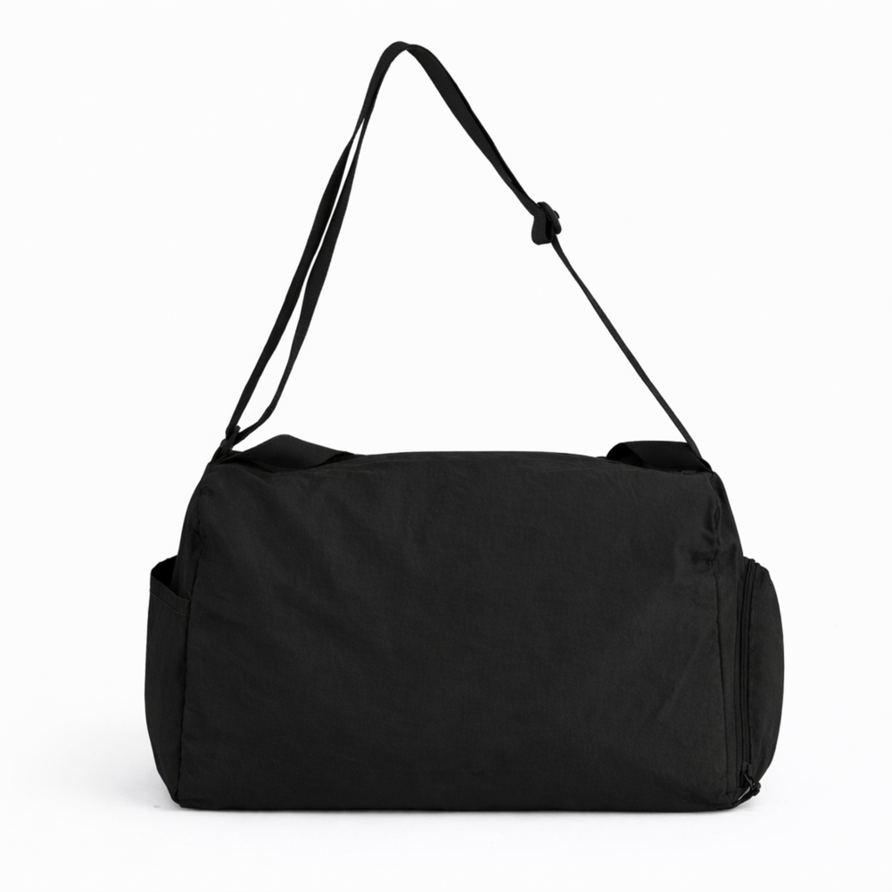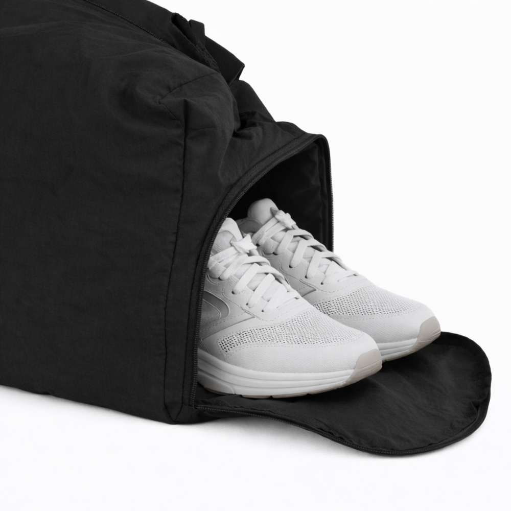 Wewnątrz torby znajduje się tylna kieszeń zapinana na zamek, idealna na telefon, klucze lub dokumenty. Zewnętrzna boczna kieszeń na buty zapinana na zamek pozwala oddzielić obuwie od reszty zawartości i utrzymać porządek. Po drugiej stronie torby umieszczono otwartą, głęboką kieszeń, idealną na bidon lub drobiazgi wymagające szybkiego dostępu.