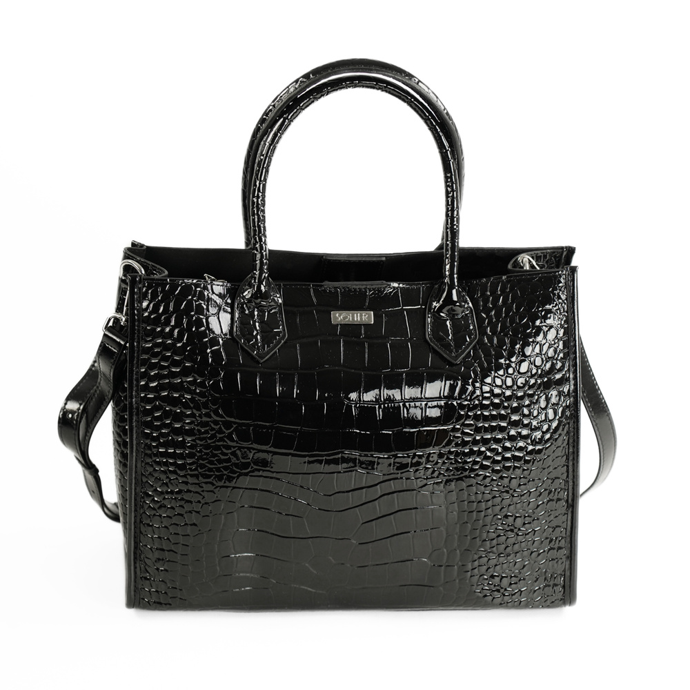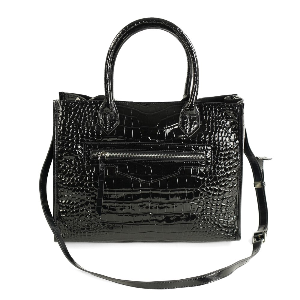 Skórzana torba damska Silvana | Zgrabna torebka damska ze skóry lakierowanej z tłoczeniem krokodyla, czarna, z rączkami i paskiem
