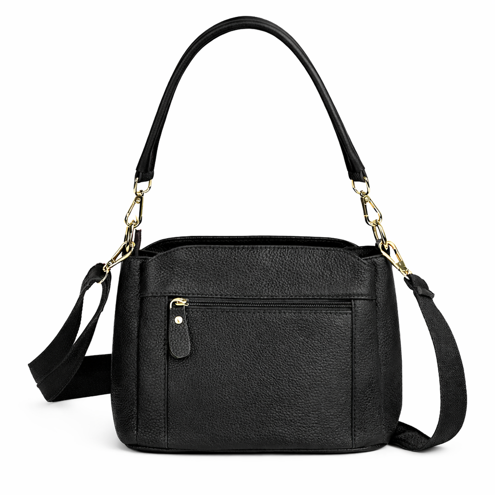 Torebka posiada aż trzy oddzielne komory – środkowa zapinana na zamek, zapewnia pełne bezpieczeństwo zawartości, natomiast przednia i tylna komora zamykane są na praktyczne zatrzaski, które gwarantują szybki dostęp do najpotrzebniejszych drobiazgów. Wewnątrz – dodatkowe kieszenie, w tym jedna zapinana na zamek, idealna na cenne przedmioty. Dodatkowo z tyłu znajduje się bezpieczna, zewnętrzna kieszeń na zamek.
