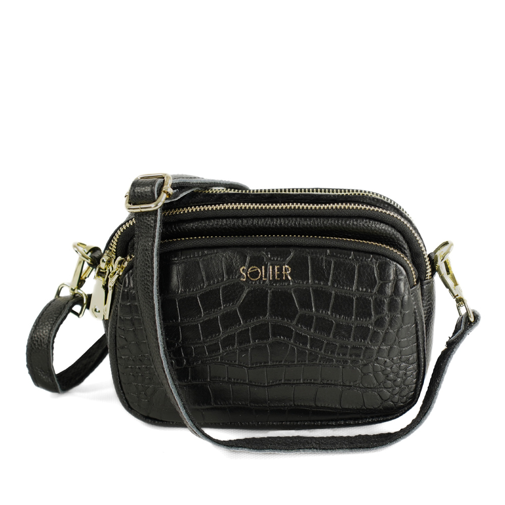 • Kompaktowa skórzana torba damska Solier FL59 AMORIA o zaskakującej pojemności. Wykonana z lakierowanej skóry naturalnej tłoczonej we wzór krokodyla, z trzema komorami na zamek i regulowanym paskiem. Praktyczny model crossbody do codziennego użytku.