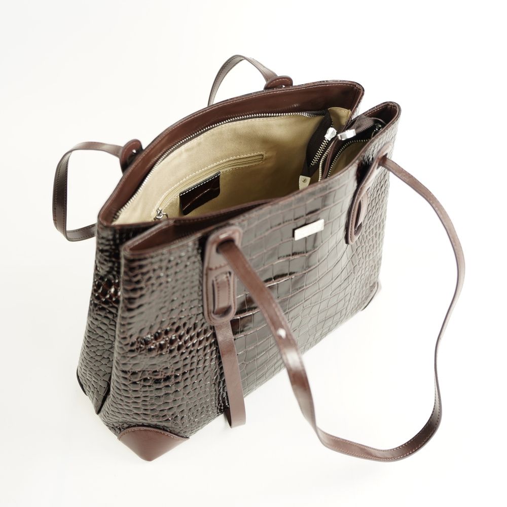 Solier FL56 ALEN to torba zaprojektowana z myślą o kobietach, które cenią klasyczny wygląd i praktyczne rozwiązania w codziennym użytkowaniu. Wykonana z wysokiej jakości lakierowanej skóry naturalnej, wyróżnia się subtelnym połyskiem, trwałością i starannym wykończeniem. Jej forma sprawia, że dobrze prezentuje się zarówno w pracy, jak i w bardziej swobodnych sytuacjach.
