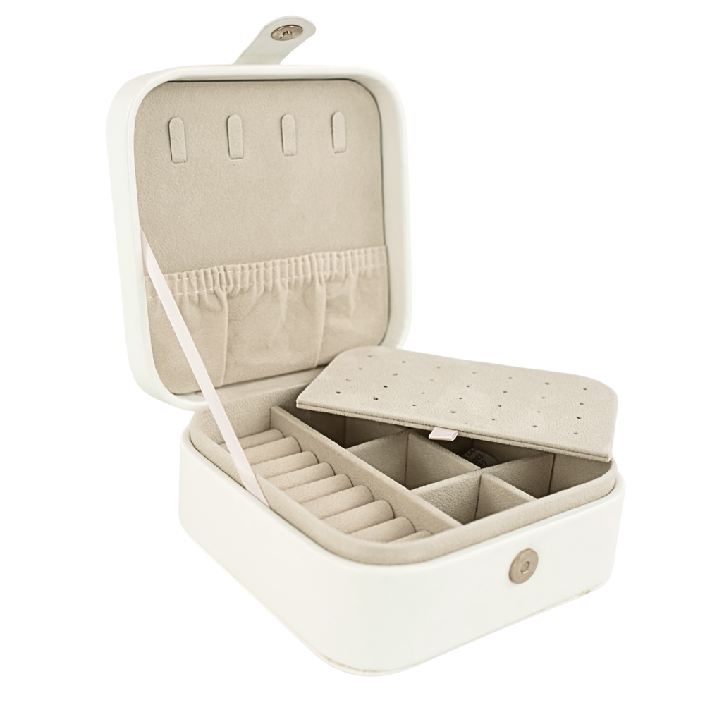 Etui zamykane jest na zatrzask – łatwo je otworzysz jedną ręką, a biżuteria pozostaje bezpieczna nawet w podróży. To praktyczne rozwiązanie, które pozwala spakować wszystko w kilka chwil.