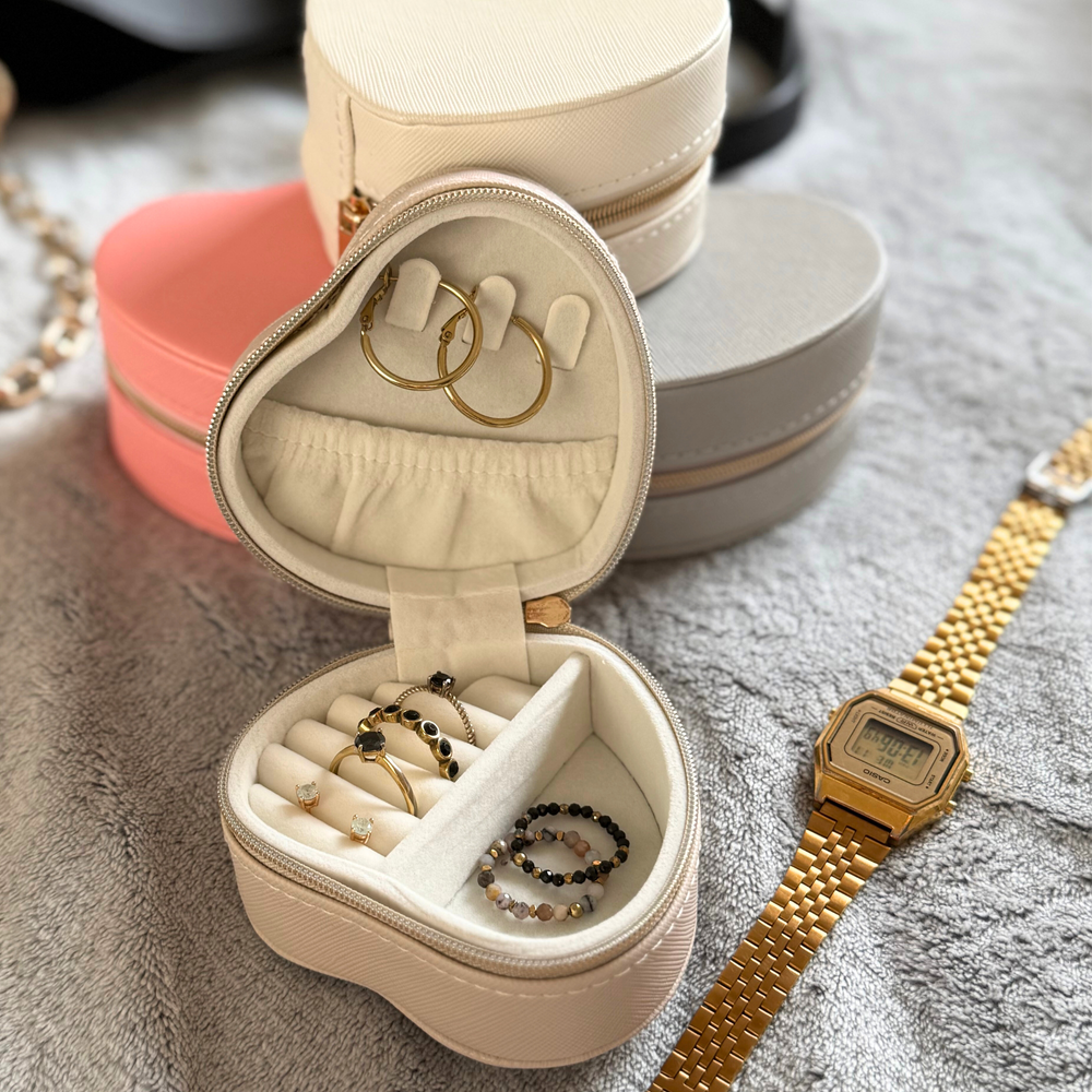 Szkatułka została zaprojektowana tak, aby wszystko było na swoim miejscu. Kompaktowy rozmiar (9,5 cm x 5,5 cm) sprawia, że bez problemu zmieści się w torebce, kosmetyczce czy szufladzie z codziennymi dodatkami. To wygodne rozwiązanie, kiedy chcesz szybko spakować ulubione kolczyki, pierścionki czy delikatne łańcuszki.